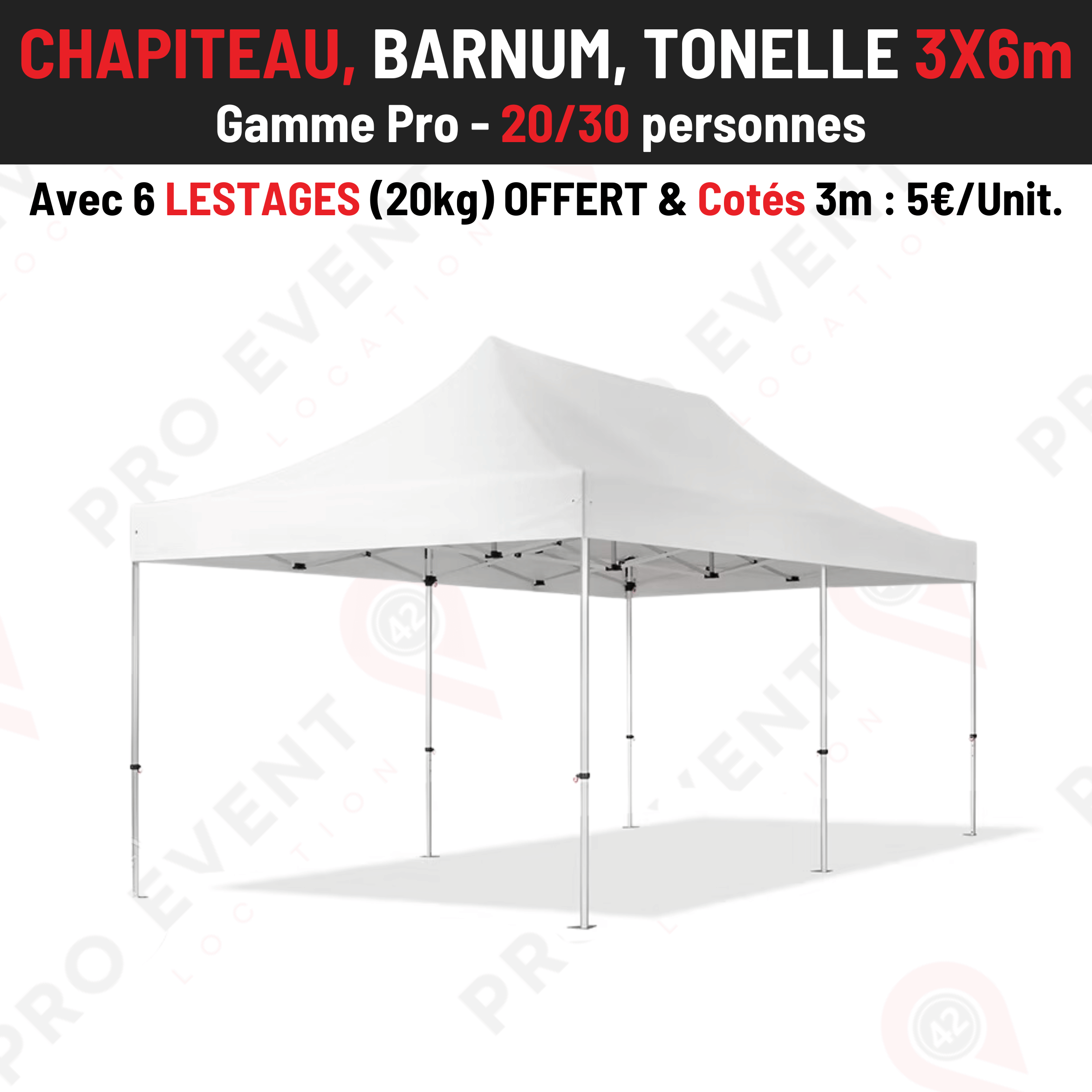 Tarif : 100€ pour un Chapiteau 3/6m (Avec 6 lestages 20kg offert)